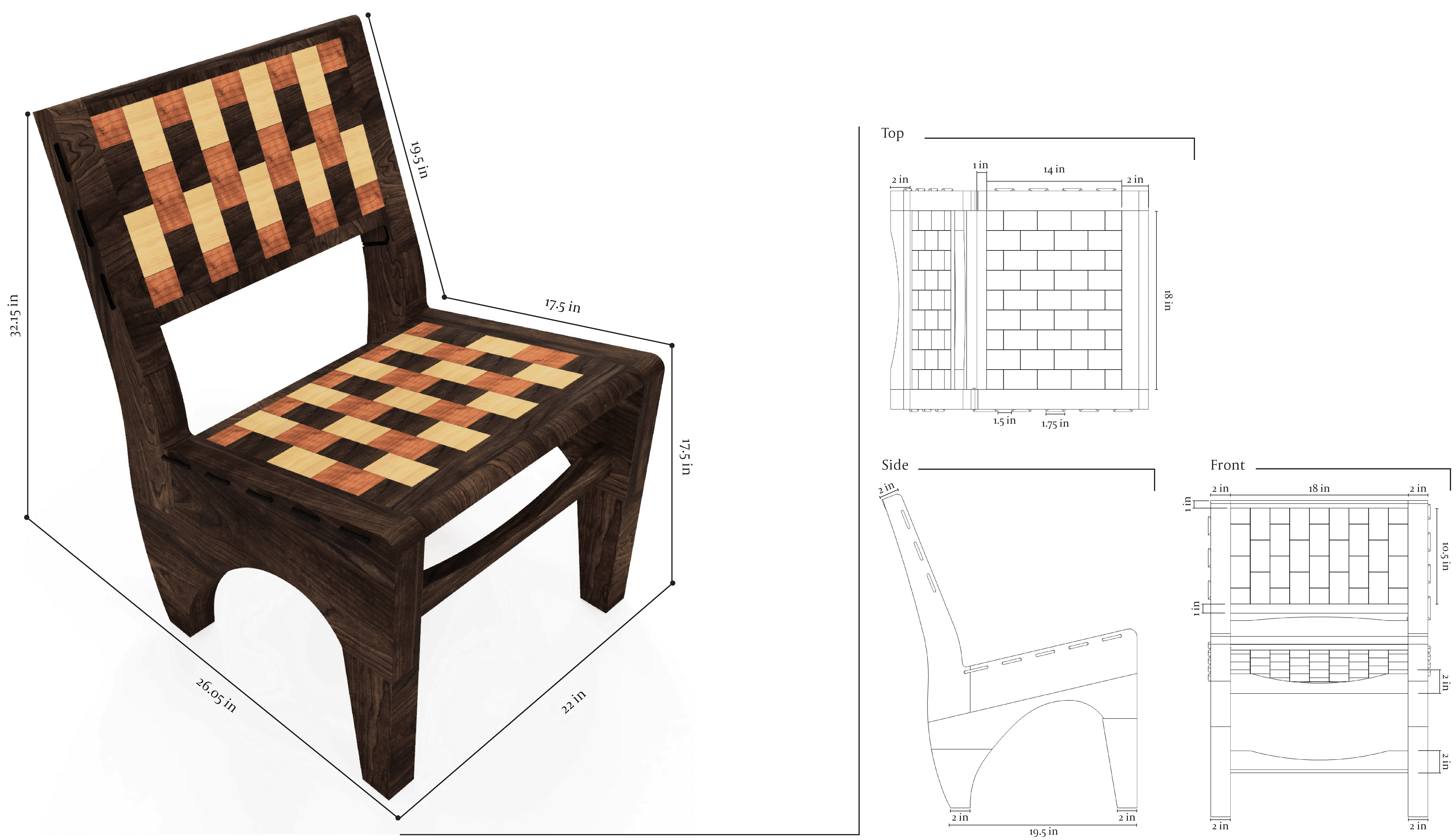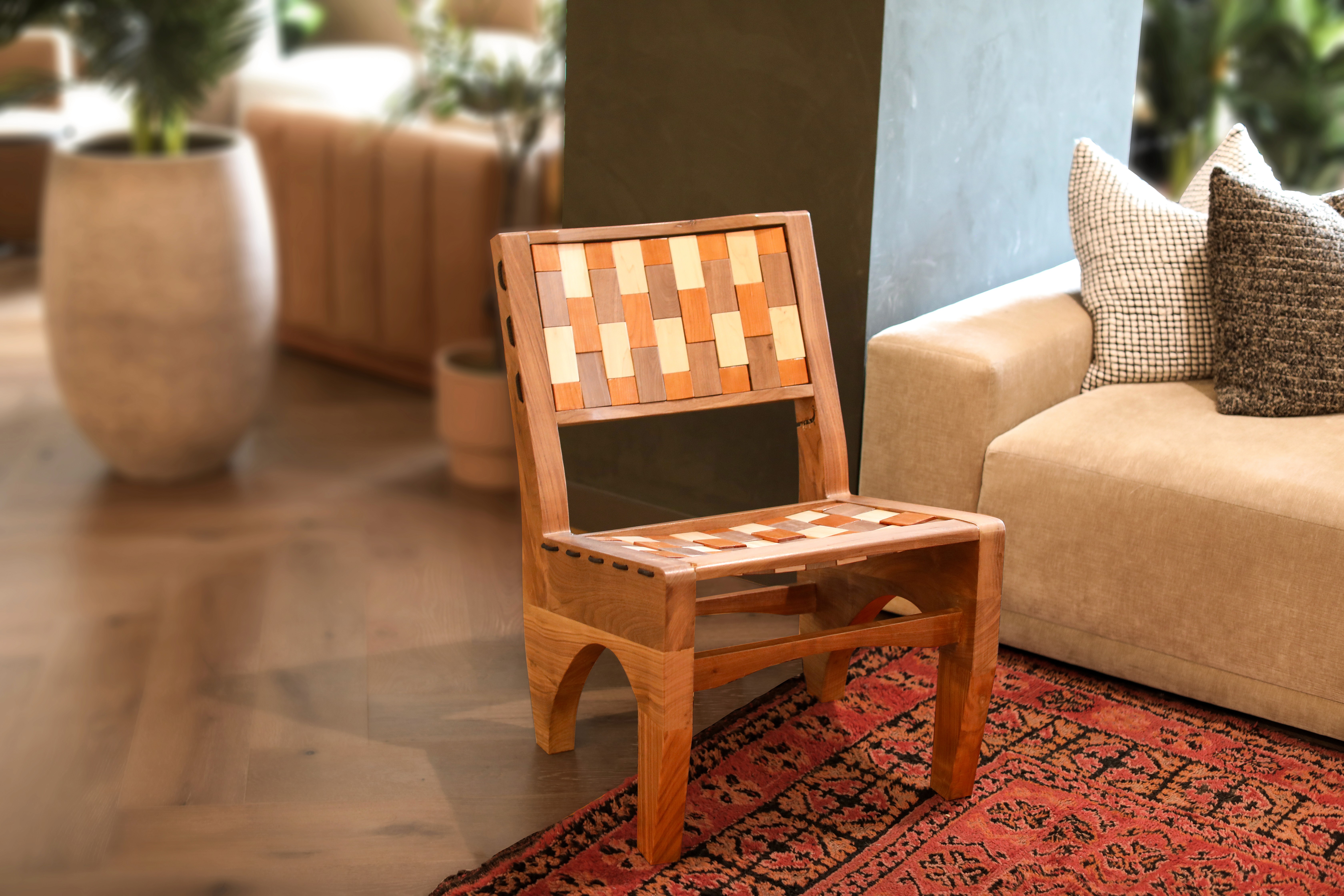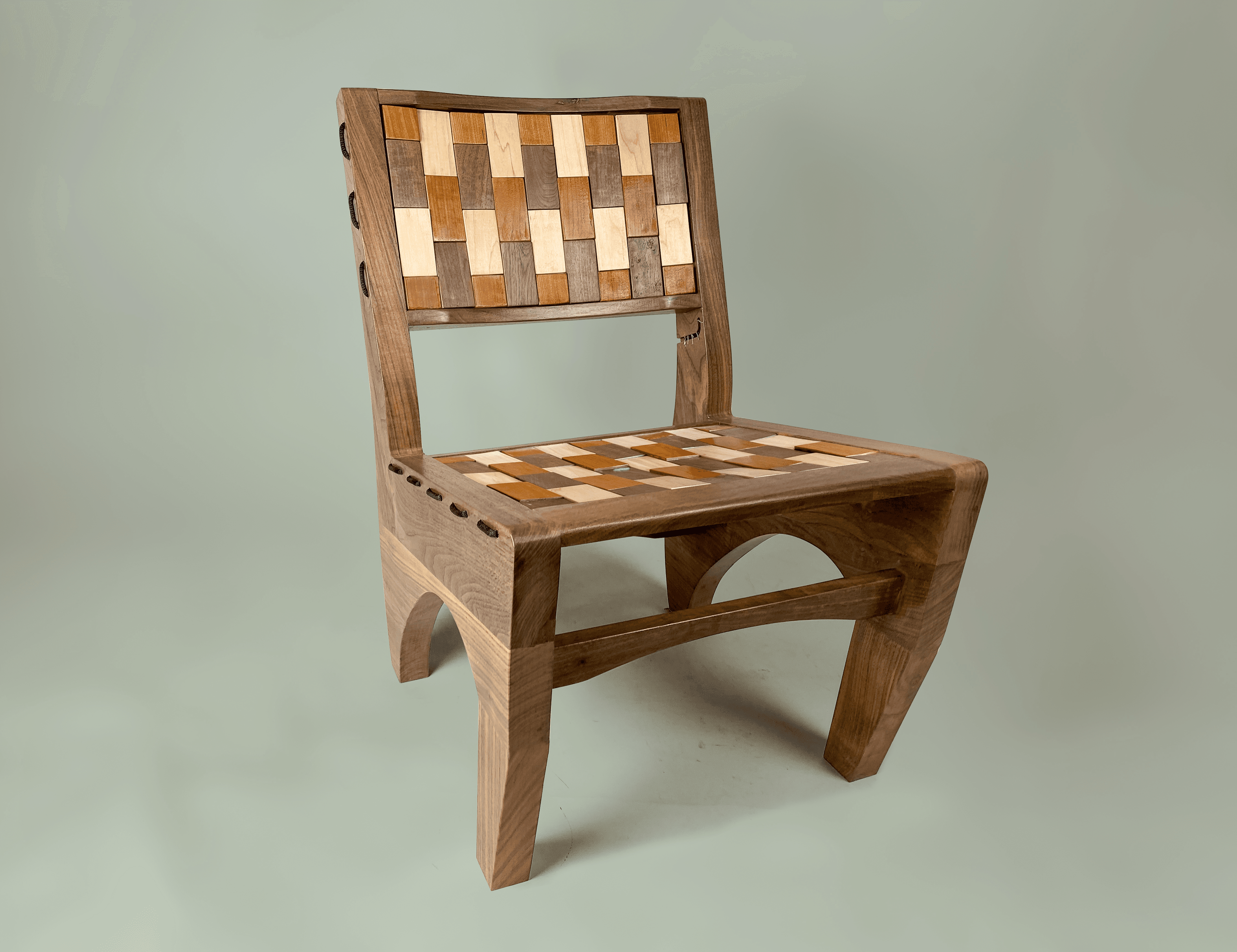 Over a 100 maple, cherry, and walnut tiles where hand cut, drilled, sanded, and finished. A mix of 73 where chosen to be strung together for the seat and back of Checkered.