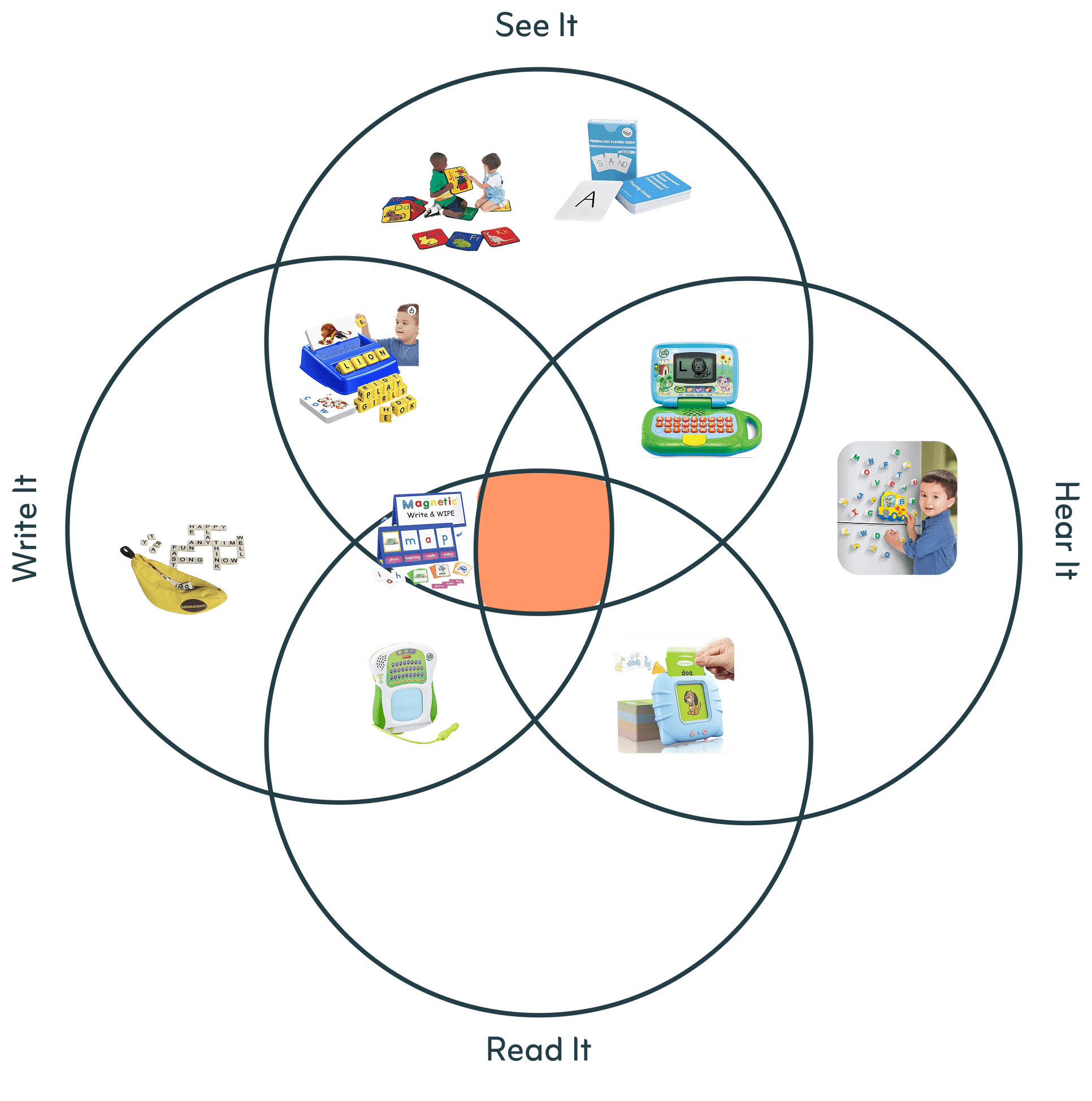 This method engages all the senses so the kid sees a visual representation of the word, hears, spells, and reads it. It is considered one of the most effective approaches.